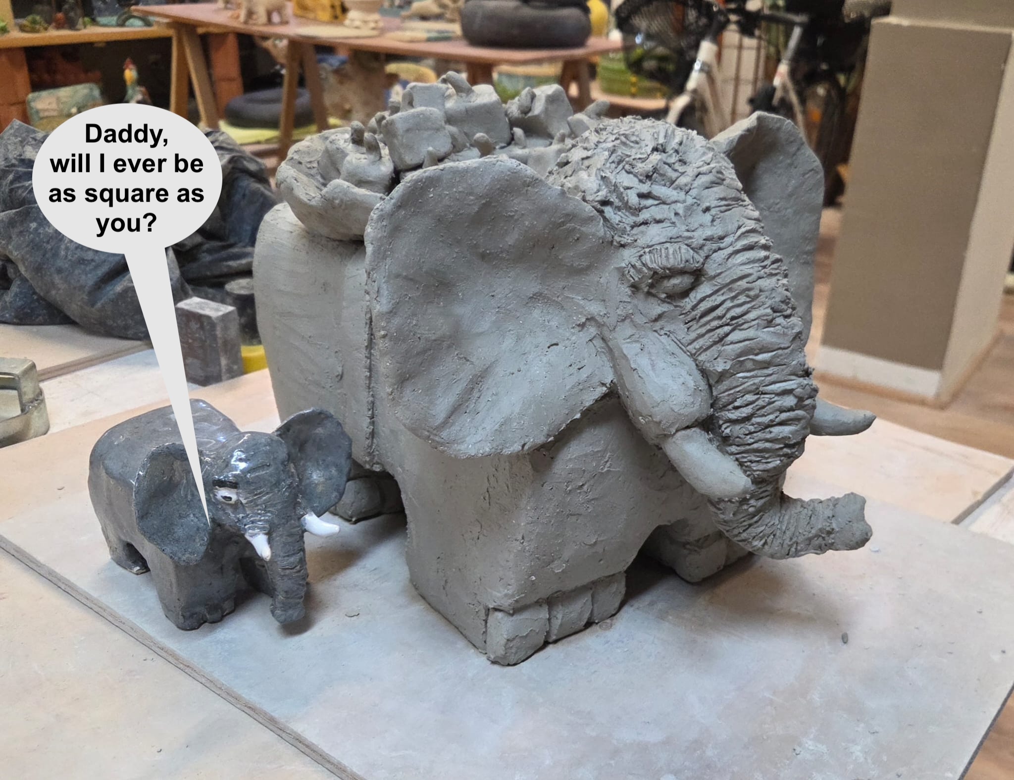Big elephant transporting square watermelons with son. Work in progress, approx 50x40cm