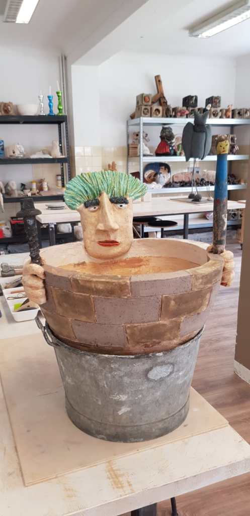 Bucket dreams Owl pot with moon on back Lion pot Lion bucket flower pot in progress Bird bucket flower pot Farmer bucket flower pot Upside down jellyfish pot in progress Head and bird pot in progress Share this: Click to share on X (Opens in new window) X Click to share on Facebook (Opens in new window) Facebook Like Loading...